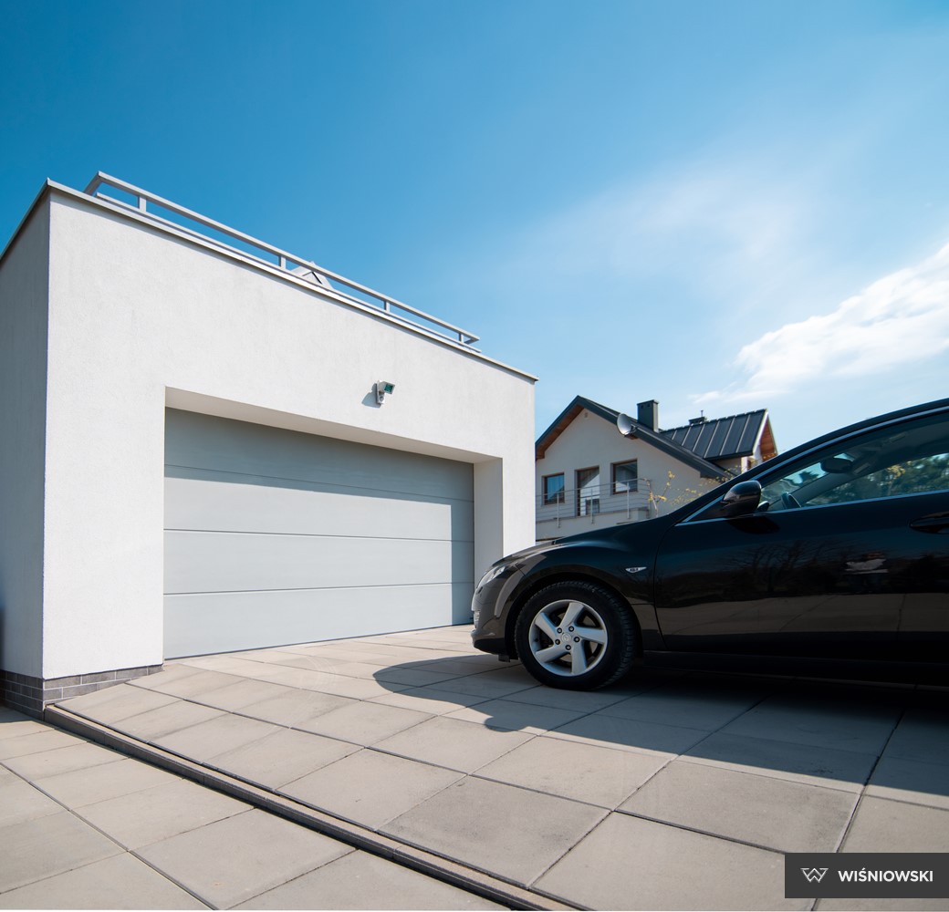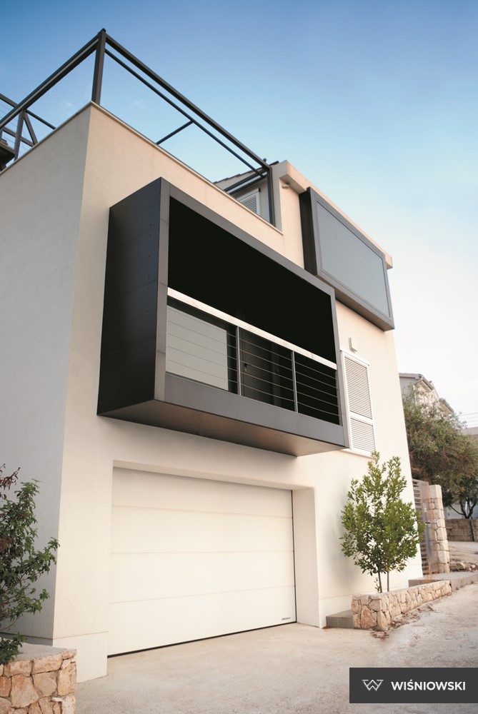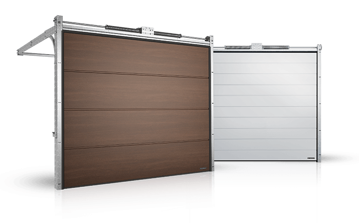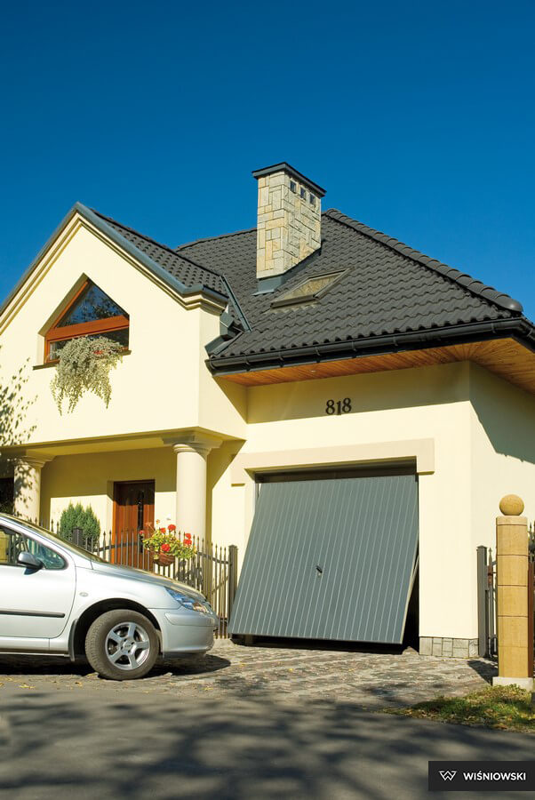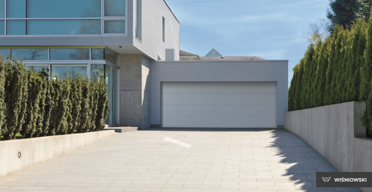 skrzydło bramy porusza się wzdłuż prowadnic pionowych i poziomych podsufitowych