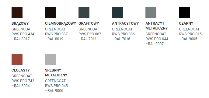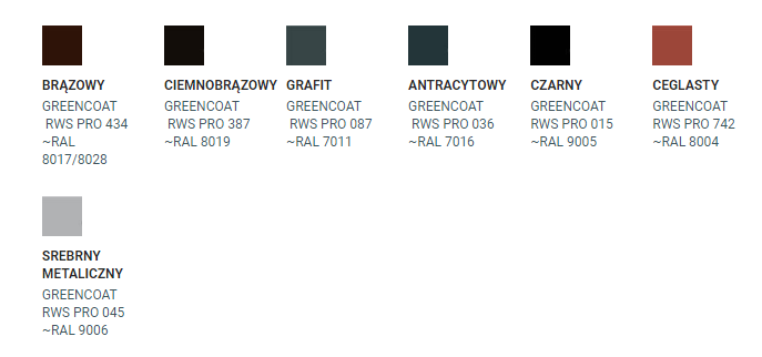 Wszystkie elementy i akcesoria rynnowe wykonane są ze stali GreenCoat RWS (Rain Water System) produkowanej przez SSAB - szwedzki koncern hutniczy o globalnym zasięgu. GreenCoat RWS został opracowany specjalnie do tworzenia wysokiej jakości systemów rynnowych. Posiada dwustronną powłokę i jest wyjątkowo trwały. Powłoki stosowane w produktach GreenCoat RWS zawierają ziarna polimeru, które zwiększają odporność powierzchni na zarysowania.